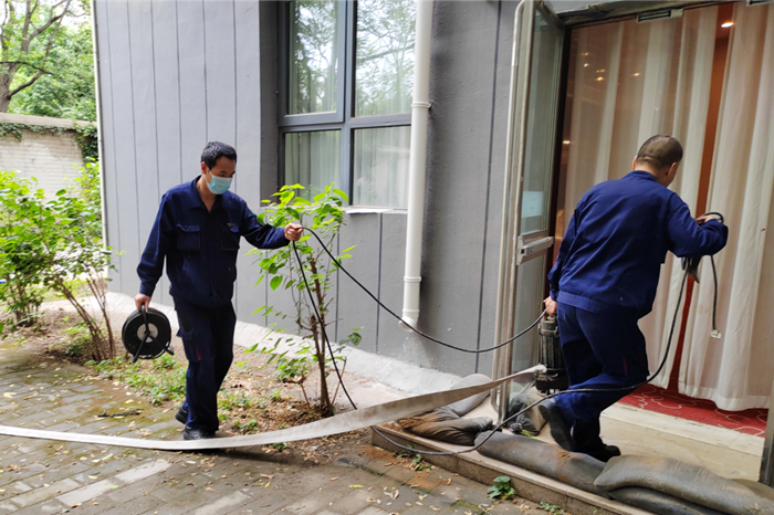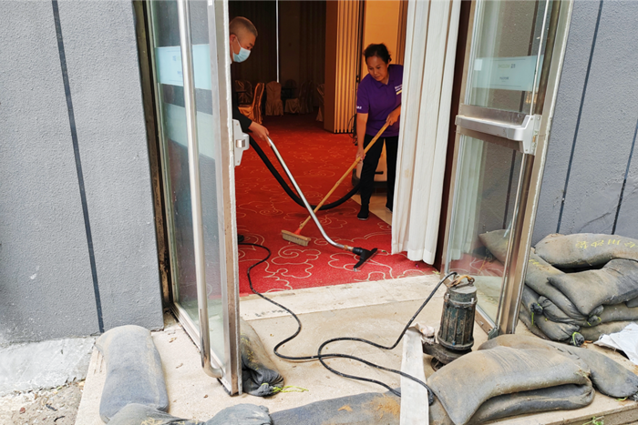 接到指令的工程部人員攜帶搶險(xiǎn)排澇設(shè)備:潛水泵、防水線軸、排水水帶趕到現(xiàn)場(chǎng),迅速開(kāi)展排澇搶險(xiǎn)工作;接到搶險(xiǎn)指令的客房部人員攜帶吸水機(jī)、舊布草、拖把隨即到達(dá)現(xiàn)場(chǎng),對(duì)室內(nèi)殘存的積水進(jìn)行了處理。最終,在參與搶險(xiǎn)的各部門人員的通力合作下,“內(nèi)澇險(xiǎn)情”得到了有效控制,保護(hù)了酒店財(cái)產(chǎn)不受損失。此次演練圓滿成功,達(dá)到了預(yù)期效果。