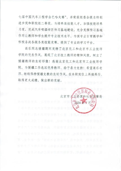 日前,北京市人力資源和社會保障局發來感謝信。對北京市工業技師學院教師高樂圓滿完成援疆工作表示誠摯的慰問和衷心的感謝!