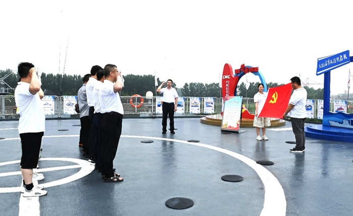 在“洪澤湖號補給艦”甲板層,全體黨員和入黨積極分子舉起右拳,面向黨旗莊嚴宣誓,誓為黨的事業(yè)奮斗終身。